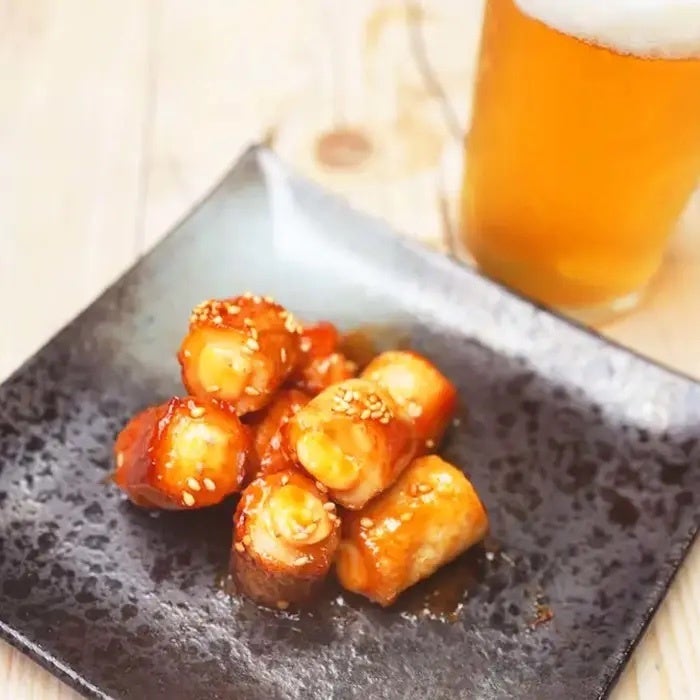 ちくわにチーズを詰めてヤンニョムだれと一緒に焼いたら出来上がり!甘じょっぱい味付で、お酒がいくらあっても足りないおつまみです。