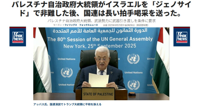 【foxnews】パレスチナ自治政府大統領がイスラエルを「ジェノサイド」で非難した後、国連は長い拍手喝采を送った。:2025.9.25**