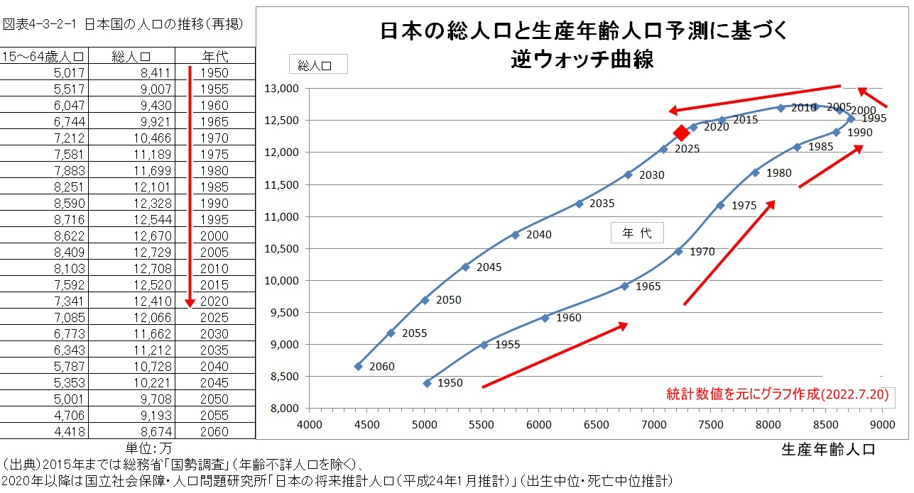 すでに総人口と生産年齢人口は、年を追うごとに減少しており統計数値をあてはめた2060年~には1950年に逆戻りする「逆ウォッチ曲線」のサイクル〔(N)作成〕が2000年代あたりから見られます。