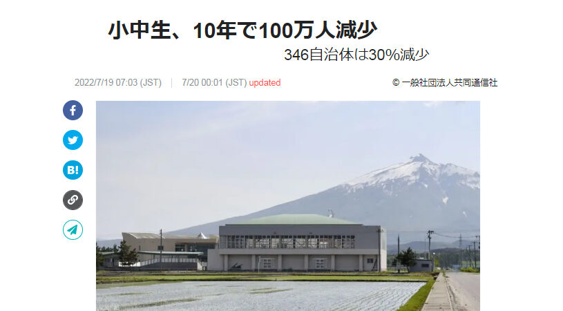 【共同通信社】小中生、10年で100万人減少 346自治体は30%減少