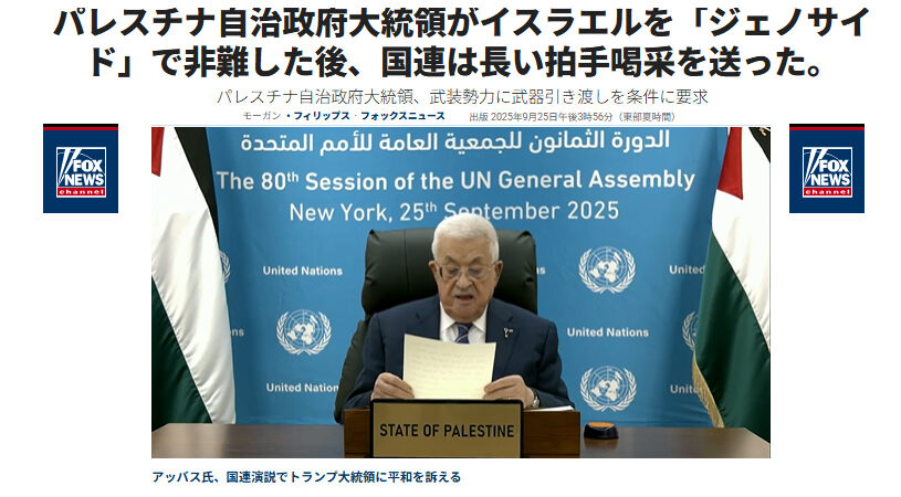 【foxnews】パレスチナ自治政府大統領がイスラエルを「ジェノサイド」で非難した後、国連は長い拍手喝采を送った。:2025.9.25**
