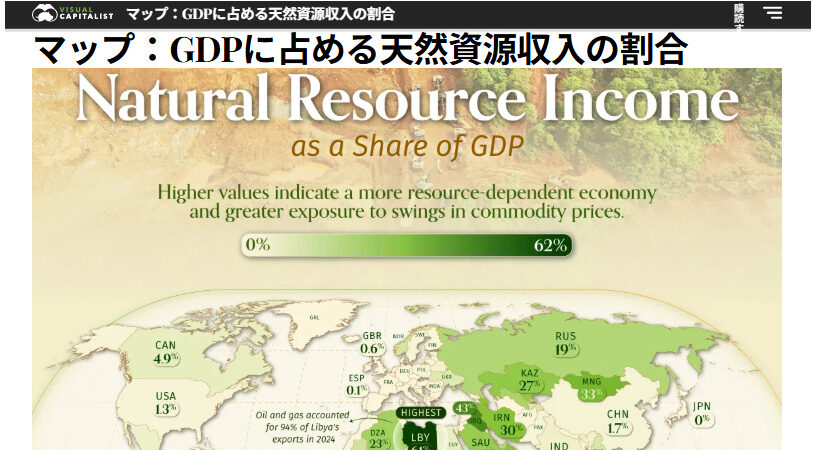 天然資源は多くの国にとって、依然として経済成長の強力な原動力となっています。石油、ガス、鉱物、森林など、これらの資産は莫大な収入を生み出す一方で、脆弱性も生み出します。この図は、天然資源収入をGDPに占める割合で示し、原材料の採掘と販売に最も依存している経済を明らかにしています。