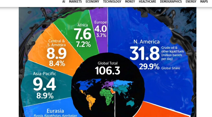 このグラフは、 EIAデータに基づいて、2025 年の世界の石油生産量を地域別に分類したものです。