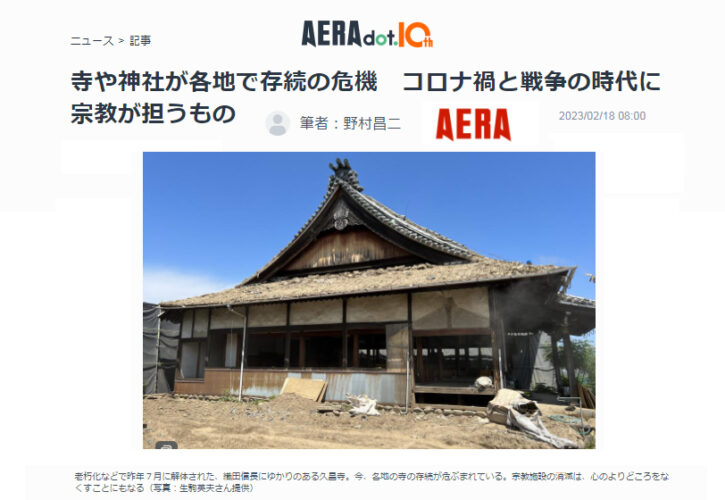 老朽化などで昨年7月に解体された、織田信長にゆかりのある久昌寺。今、各地の寺の存続が危ぶまれている。宗教施設の消滅は、心のよりどころをなくすことにもなる(写真:生駒英夫さん提供) コロナ禍で寺院消滅のスピードが加速し、死との向き合い方も変わってきた。ウクライナでの戦争で世界が分断する──。そんな時代だからこそ、宗教の役割が増してきたという。それは一体、何か。AERA 2023年2月20日号の記事を紹介する。