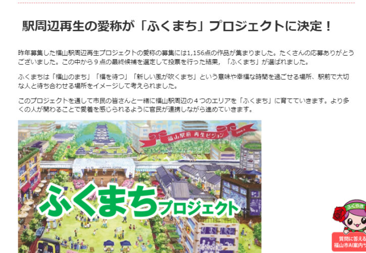 昨年募集した福山駅周辺再生プロジェクトの愛称の募集には1,156点の作品が集まりました。たくさんの応募ありがとうございました。この中から9点の最終候補を選定して投票を行った結果,「ふくまち」が選ばれました。