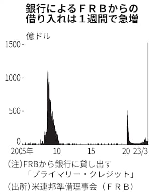 【ワシントン=高見浩輔】米連邦準備理事会(FRB)は16日、銀行からの資金借り入れが15日時点で1528億ドル(約20兆円)に急増したと発表した。リーマン危機時を抜いて過去最高を記録した。相次ぐ米銀の破綻で金融市場は動揺しており、資金繰りを「最後の貸し手」である中央銀行に頼っている。