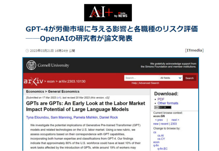 大規模言語モデル(LLM)の「GPT-4」を手掛けた米OpenAIとペンシルベニア大学の研究者らは3月17日、「GPTはGPT:LLMの労働市場への影響の可能性に関する初期の考察」と題した論文を公開した。「GPT(Generative Pre-trained Transformer)モデルと関連技術が米国の労働市場に与える潜在的な影響を調査」したとしている。