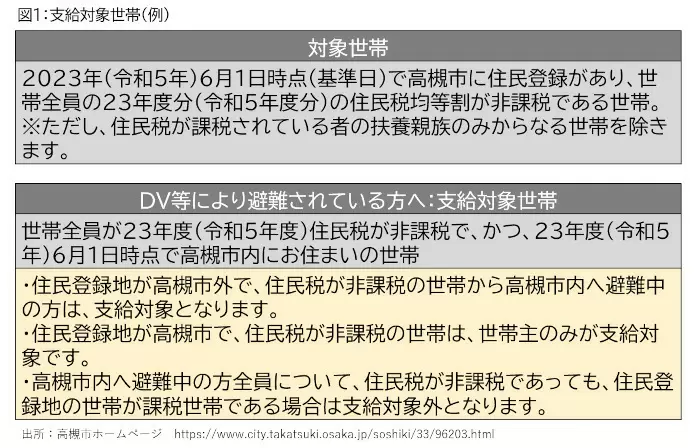 給付金の名称は「令和5年度住民税非課税世帯に対する負担軽減給付金」であり、支給対象は図1のように、本来の対象世帯に加え、「DV等で高槻市内へ避難されている方」も、高槻市から給付金を受給できる場合があることが記されている。