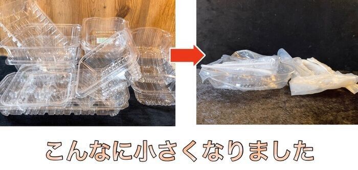 卵パックや総菜、お漬物、ミニトマト、しいたけなどが入ったプラスチック容器ってかさばりますね。手でつぶして無理に押し込んでゴミ袋が破れてしまったりと厄介です。