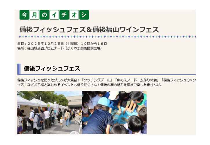 備後フィッシュを使ったグルメが大集合!「タッチングプール」「魚のスノードーム作り体験」「備後フィッシュ○×クイズ」などお子様と楽しめるイベントも盛りだくさん!備後の海の魅力を家族で楽しみませんか。