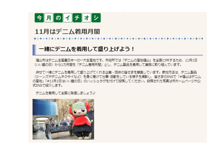 福山市はデニム生産量日本一の一大生産地です。市役所では「デニムの産地福山」を全国にPRするため、11月1日(いい藍の日)から1カ月間を「デニム着用月間」とし、デニム製品を着用して業務に取り組んでいます。