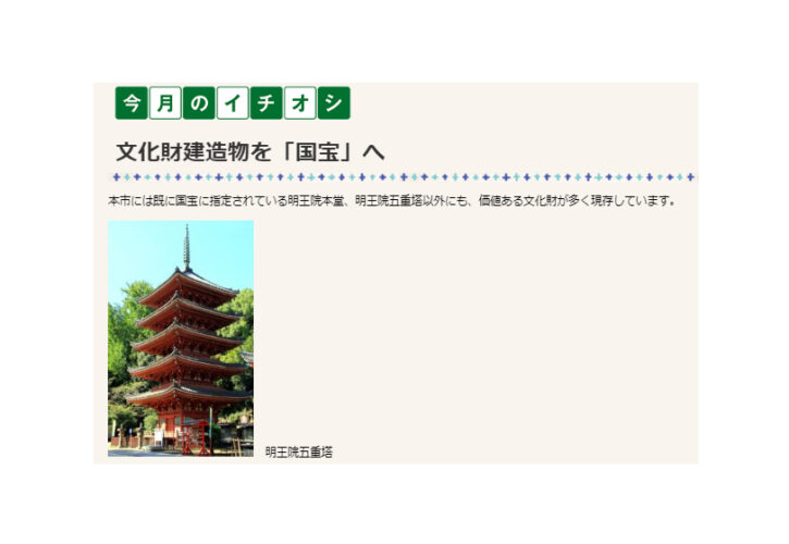 本市には既に国宝に指定されている明王院本堂、明王院五重塔以外にも、価値ある文化財が多く現存しています。