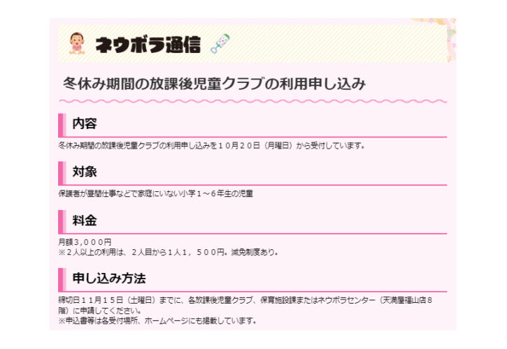 締切日11月15日(土曜日)までに、各放課後児童クラブ、保育施設課またはネウボラセンター(天満屋福山店8階)に申請してください。
