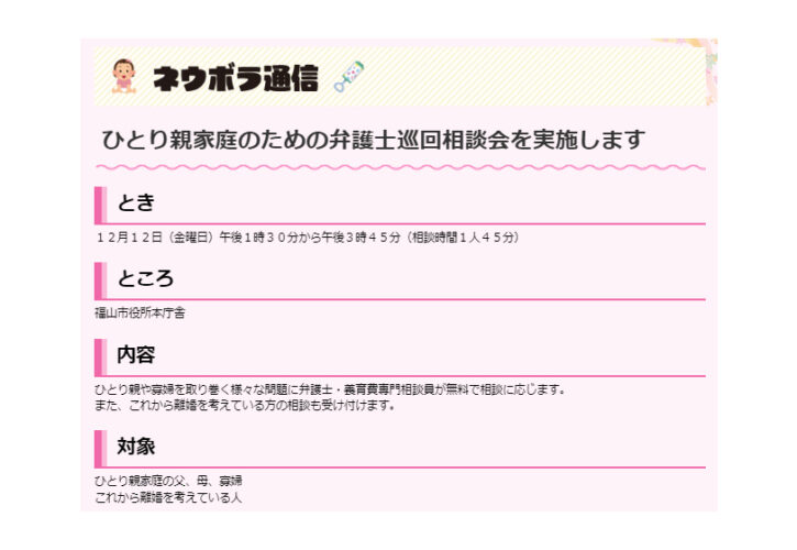 ひとり親家庭のための弁護士巡回相談会を実施します