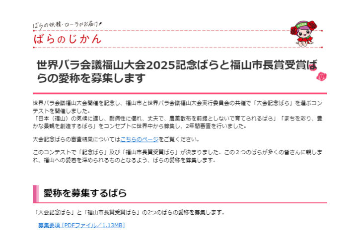 このコンテストで「記念ばら」及び「福山市長賞受賞ばら」が決まりました。この2つのばらが多くの皆さんに親しまれ、福山への愛着を深められるものとなるよう、ばらの愛称を募集します。