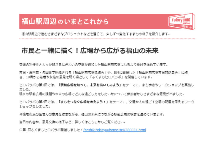 市民・専門家・各団体で組織される「福山駅前広場協議会」や、8月に開催した「福山駅前広場市民対話集会」に続