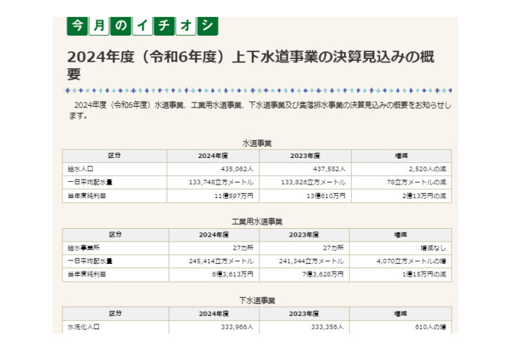 2024年度(令和6年度)水道事業、工業用水道事業、下水道事業及び集落排水事業の決算見込みの概要をお知らせします。