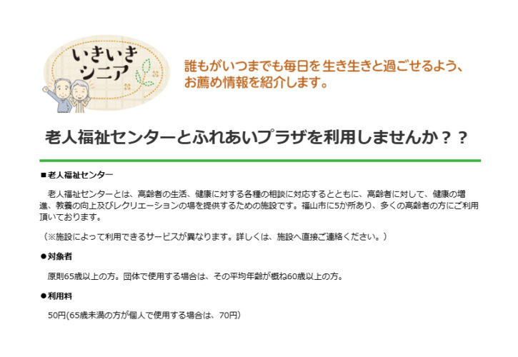 ふれあいプラザとは、老人福祉センターと同様に、高齢者の健康の増進、講座の開催等を含めて、交流や、生きがいづくりの場として、レクリエーションの便宜を提供するための施設です。福山市内に27か所あり、それぞれのふれあいプラザが各地域で運営を行っています。