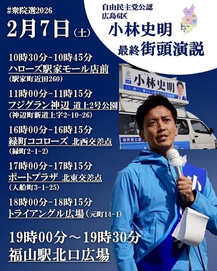 地元広島6区は、小林史明さんが6回目の当選を目指して福山市内をくまなく駆け抜けています。