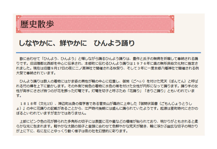 歌に合わせて「ひんよう、ひんよう」と囃しながら踊るひんよう踊りは、豊作と氏子の無病を祈願して奉納される踊りです。旧沼隈郡北西部を中心に伝承され、本郷町に伝わるひんよう踊りは1976年に県の無形民俗文化財に指定されました。現在は旧暦9月17日の夜に二ノ宮神社で開催される秋祭り、そして3年に一度本郷八幡神社で開催される例大祭で奉納されています。