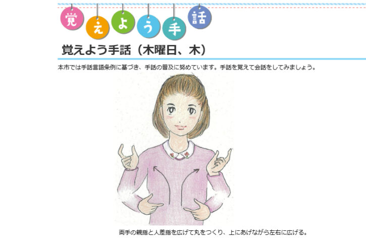 本市では手話言語条例に基づき、手話の普及に努めています。手話を覚えて会話をしてみましょう。