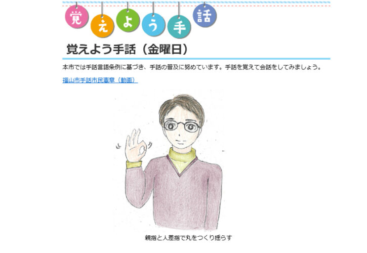 2026.03.27 ニュース一覧, ◎広報ふくやま, ◆医療・福祉・子育て 覚えよう手話(金曜日) 2026年3月1日更新 覚えよう手話(金曜日) 本市では手話言語条例に基づき、手話の普及に努めています。手話を覚えて会話をしてみましょう。 福山市手話市民憲章(動画) 親指と人差指で丸をつくり揺らす このページに関するお問い合わせ先 障がい福祉課 Tel:928-1062 Fax:928-1730 投稿者: okazaki-N ニュース一覧, ◎広報ふくやま, ◆医療・福祉・子育て 生活を豊かに 山野水力電気発電所前の記事