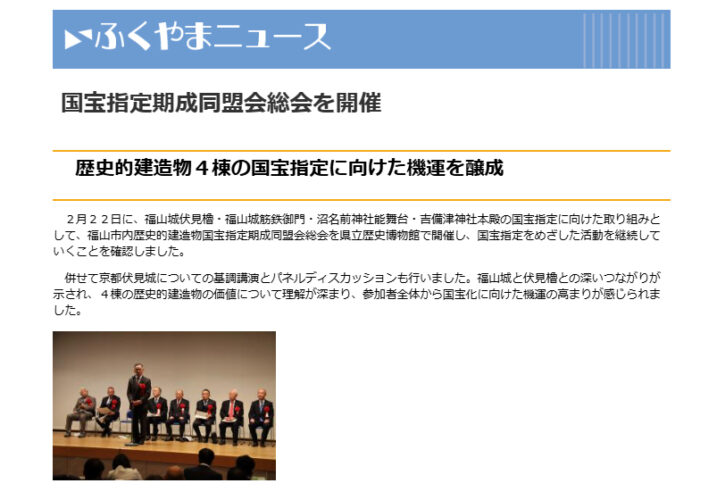 2月22日に、福山城伏見櫓・福山城筋鉄御門・沼名前神社能舞台・吉備津神社本殿の国宝指定に向けた取り組みとして、福山市内歴史的建造物国宝指定期成同盟会総会を県立歴史博物館で開催し、国宝指定をめざした活動を継続していくことを確認しました。