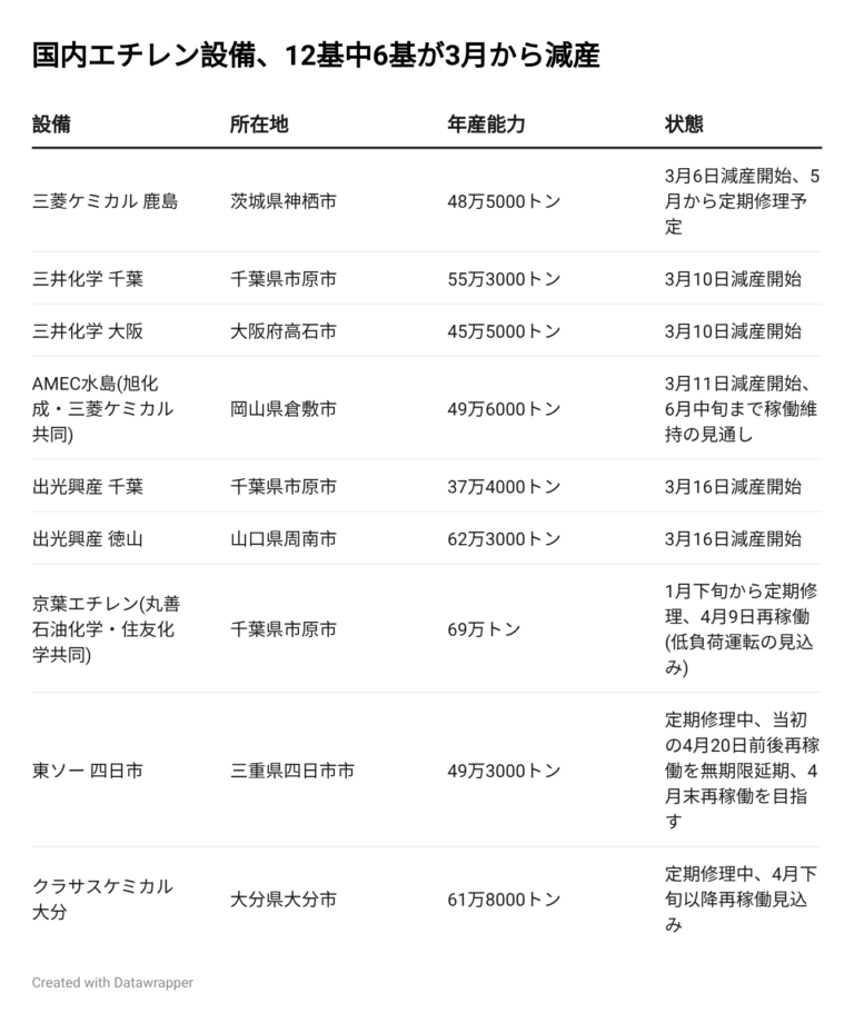 国内エチレン設備12基のうち、通常稼働は3基だけだ。6基が3月上旬から減産を続け、4月に入っても状況は変わらない。残る3基は定期修理中だ。主要9基の動きは以下の通り。