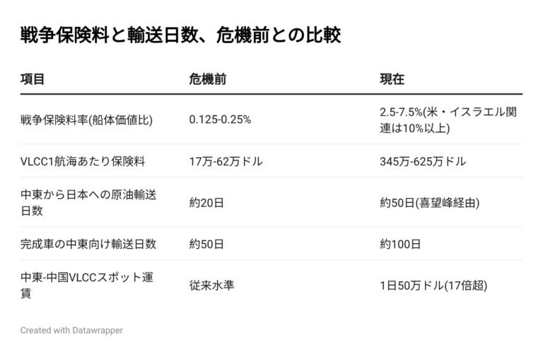 自動車は輸送と塗料の両面で制約を受けている。邦船3社は2月28日にホルムズ海峡の通航を止め、喜望峰経由に切り替えた。戦争保険料と輸送日数は危機前から大幅に上昇した。
