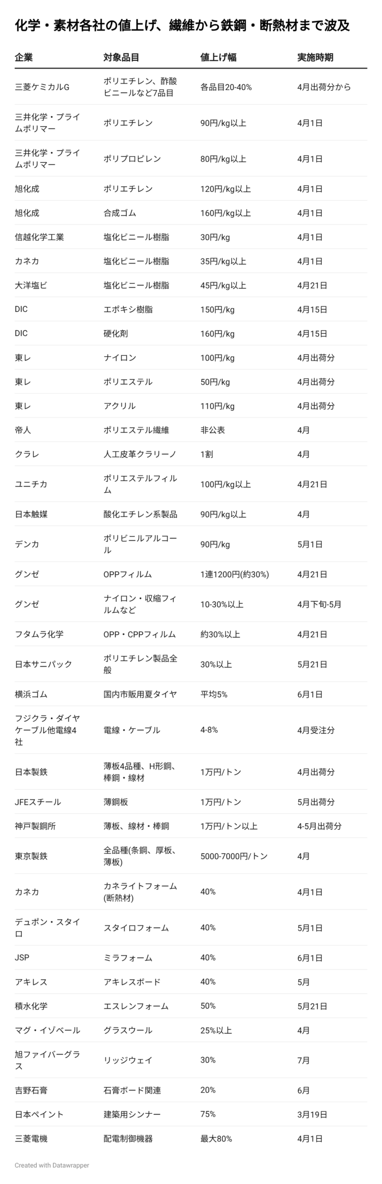 減産は川下の値上げに直結した。化学大手の値上げは繊維、鉄鋼、断熱材、包装フィルム、電線、タイヤ、塗料まで広がっている。