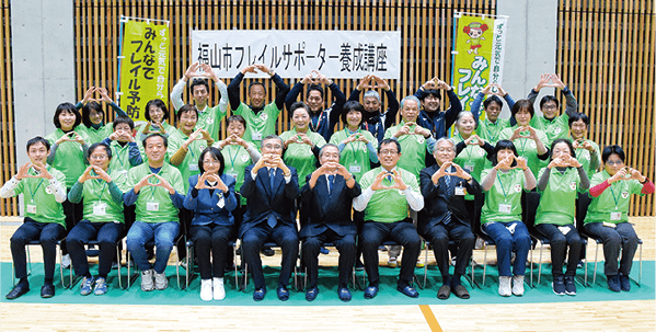 フレイルサポーターとは継続的にフレイル予防に取り組めるよう応援する市民ボランティアです。養成講座を受け、基礎知識やフレイルチェックの方法、具体的なアドバイスについて学んでいます。現在約50人が活躍。フレイルチェック会で参加者をサポートしています。