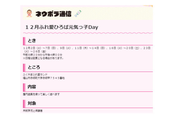 【福山市HP】子育て支援サイト【福山ネウボラ】公園・イベント情報が探しやすくなりました。