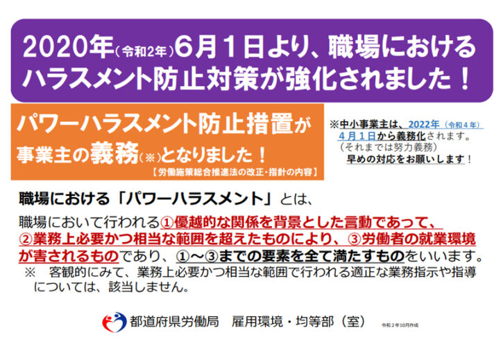 令和2年1月15日にパワーハラスメントに関して雇用管理上講ずべき措置等について定めた指針等が告示されました。